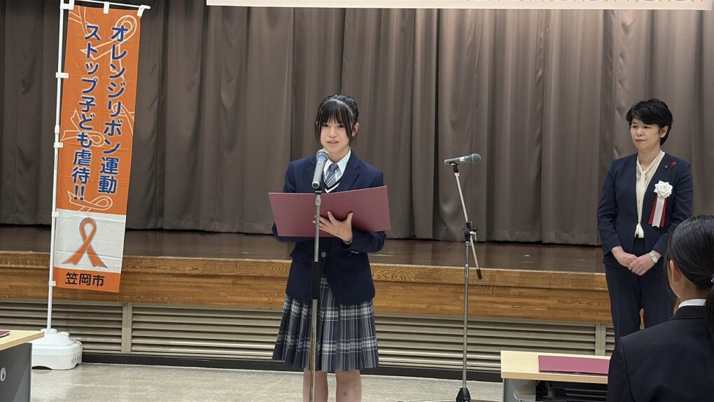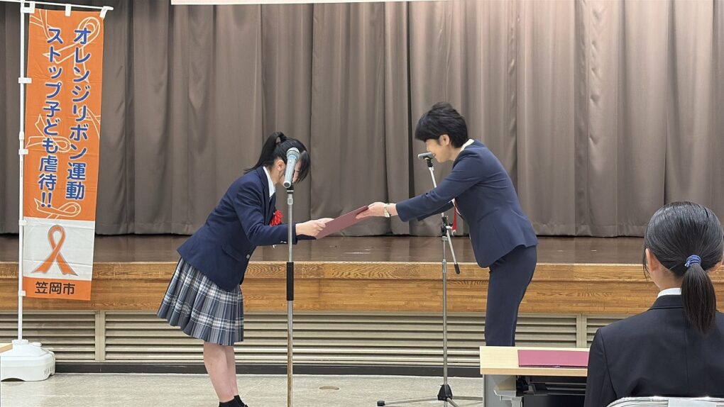 「ストップ・ザ・虐待」川柳2025において、本校中学2年生の小野奈々子さんが優秀賞を受賞し、授賞式に参加しました。