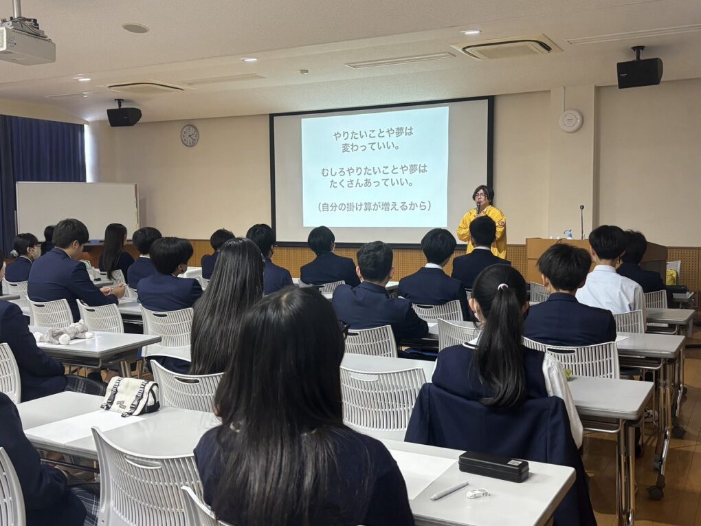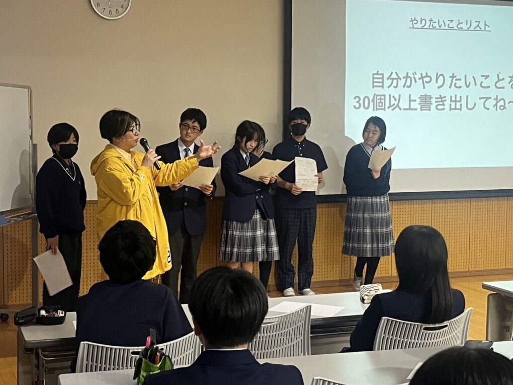 11月10日(月)、第3回アントレプレナーシップ講座が行われました。今回の講師は、瀬戸内サニー株式会社 代表取締役 大崎龍史様です。『「好き」を仕事にできる時代の生き方』というテーマで、やりたいことを100個書き出すワークを通して自分の「好き」に迫りました。どんなに奇想天外でもまずは言葉にしてみようと声をかけていただき、たくさんの楽しい「やりたいこと」を見つけることができ、夢を言語化することの大切さを学びました。講演後には、学校紹介動画を撮影していただきました。完成が楽しみです。大崎様、本日はまことにありがとうございました。