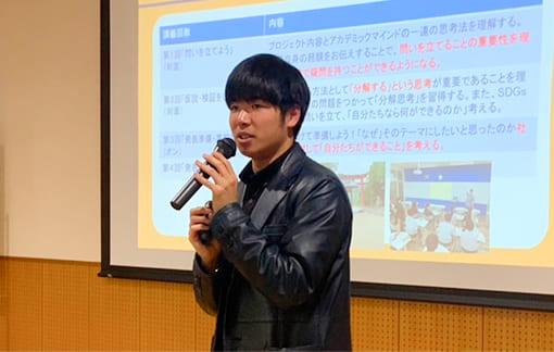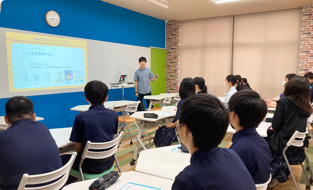 蒼明学院中等部では、2年生を対象に「アカデミックマインド養成講座」を実施しています。講師を務めるのは、教育・出版・メディア事業を展開する株式会社カルぺ・ディエムに所属する東大生や東大の卒業生たち。自らの経験をもとに、中学生の視点に立って講座を企画・運営しています。