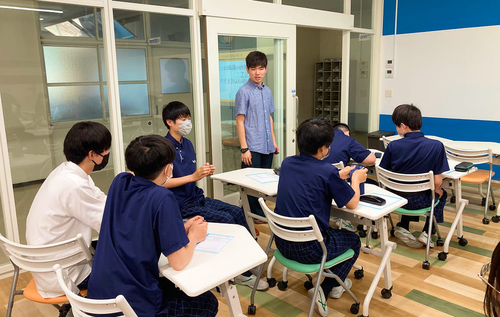 この講座がより実りある時間となるのは、1・2年次に「合教科型探究学習」などで探究の土台が築かれているからです。タブレットや大型ディスプレイなどICT環境が整った「QUEST LABO」では、思考の整理や発表もスムーズに行われ、生まれた問いや仮説に対して、根拠を持って考え、仲間と議論しながら検証する力が育まれています。