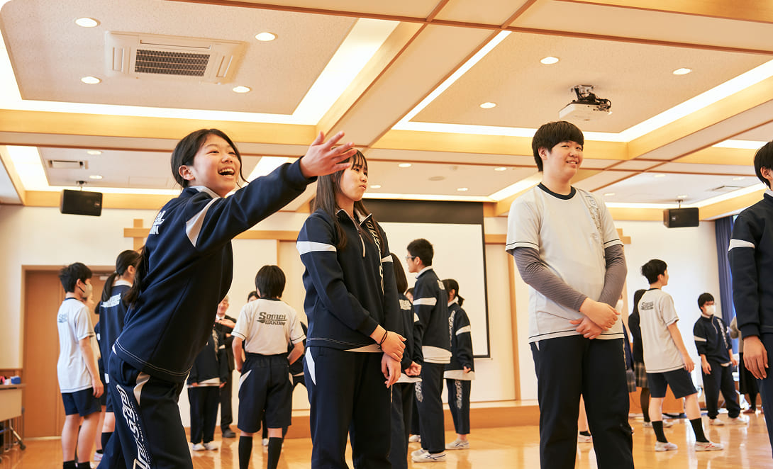 蒼明学院中等部の「ドラマ教育」は、演劇的な手法を通じて、表現力やコミュニケーション力を自然に育てる新しい学びです。即興劇やワークショップを楽しみながら、「自分らしさ」や「社会性」を身につけていく本プログラムは、2024年度よりスタートしました。仲間と共に感じ、伝え、共感し合うことで、人と人とのつながりを体感し、生きる力の土台を育てていきます。