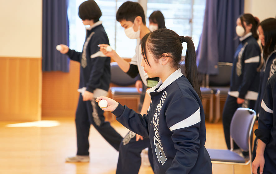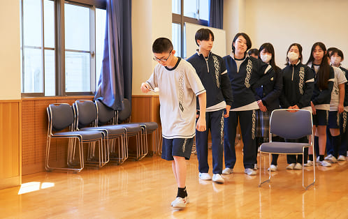 演劇の技法を活かしたワークショップや即興劇、台本を使った演技などの活動を通じて、仲間と関わりながら自分の思いや考えを伝える力を育てます。演技の上達を目的とするのではなく、感じること・伝えること・相手を理解することを重視しているのが特徴です。授業ではまず、音楽に合わせて体を動かす活動などを通じて、言葉を使わないコミュニケーションを体験。その後、役を演じる中で「自分ではない誰か」になりきることによって、相手の気持ちや視点に自然と寄り添えるようになります。