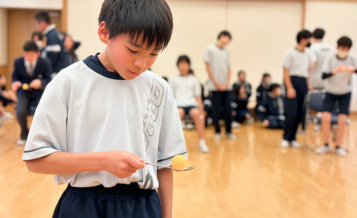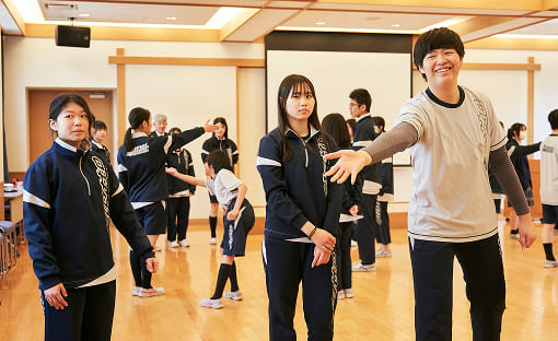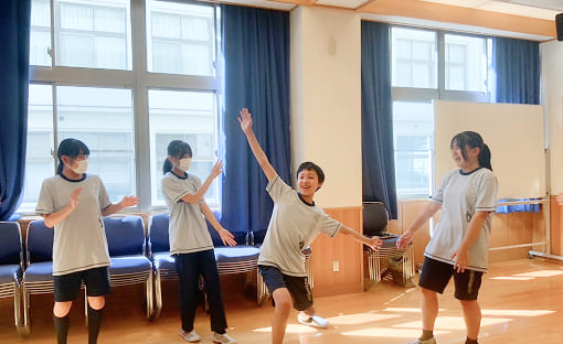 演劇の技法を活かしたワークショップや即興劇、台本を使った演技などの活動を通じて、仲間と関わりながら自分の思いや考えを伝える力を育てます。演技の上達を目的とするのではなく、感じること・伝えること・相手を理解することを重視しているのが特徴です。授業ではまず、音楽に合わせて体を動かす活動などを通じて、言葉を使わないコミュニケーションを体験。その後、役を演じる中で「自分ではない誰か」になりきることによって、相手の気持ちや視点に自然と寄り添えるようになります。